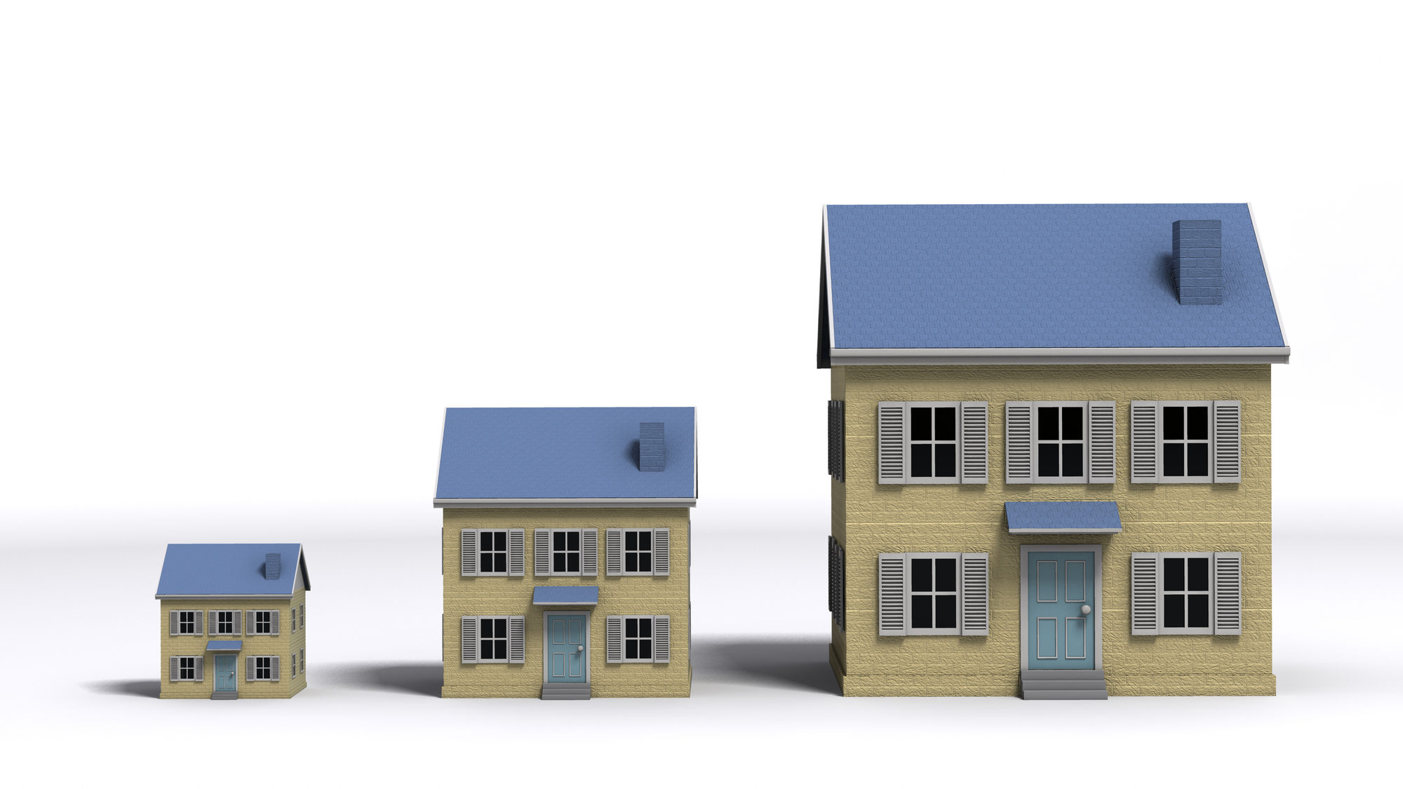 Attēlā trīs lielas mājas. Taču māju lielums jāskatās kontekstā. Vislielākā no tām būs maza, ja skatīsim kontekstā ar kādu Dubajas debesskrāpi.