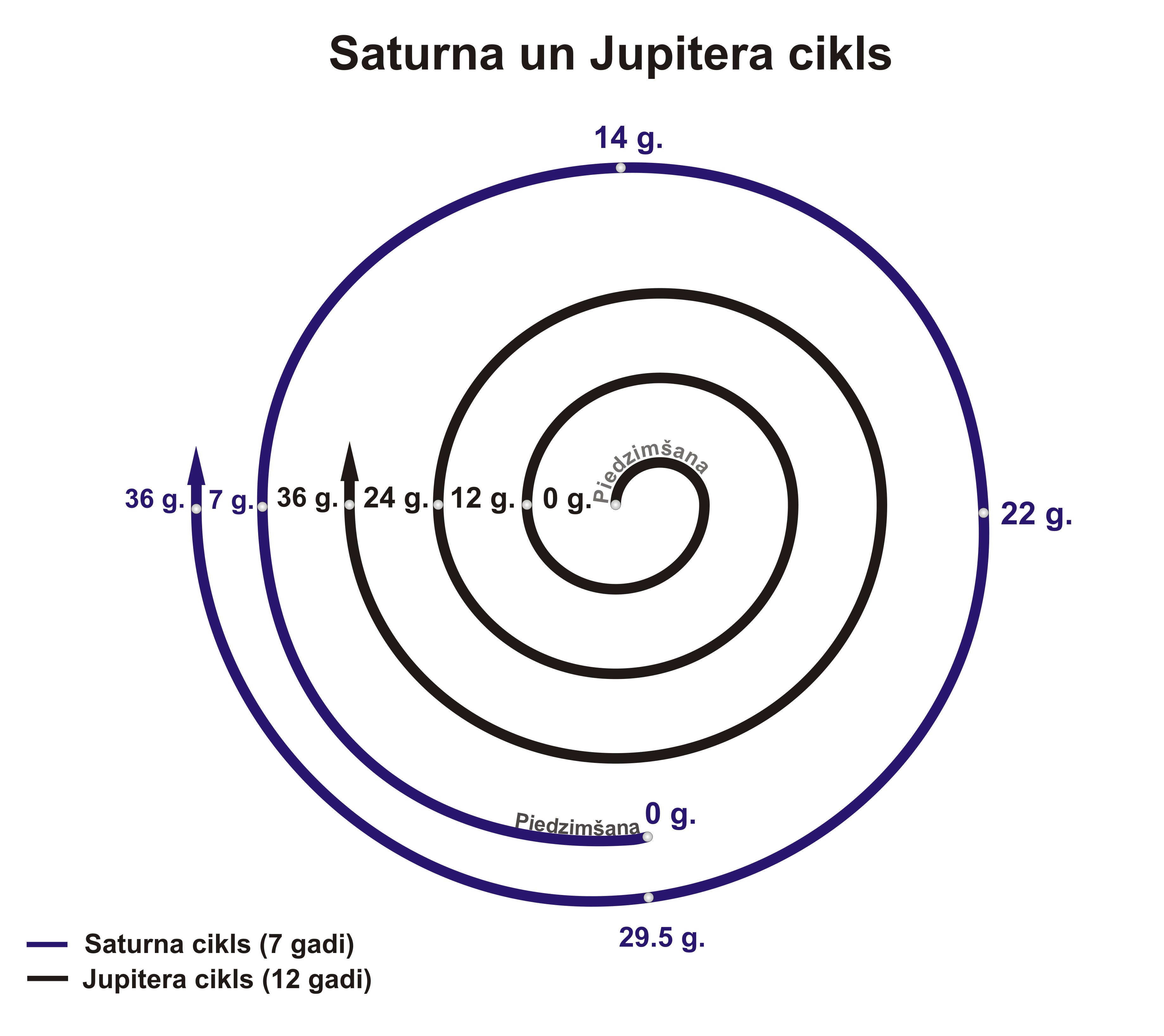Dažas reizes dzīvē abu planētu cikli pārklājas un tad iestājas interesantākie, intensīvākie dzīves periodi. Jupitera cikls ir aptuveni 12 gadi. Savukārt Saturna cikls ir 29,5 gadi. Uz šo divu planētu mijiedarbību balstās visa senā astroloģija, ieskaitot mums tik pazīstamo austrumu astroloģijas 60 gadu ciklu, kurā ietilpst 5x12 Jupitera cikls un 2x29,5 Saturna cikls.
